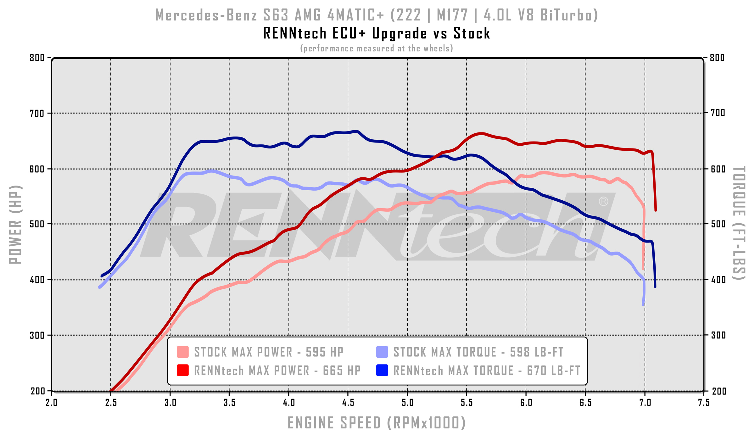 - Numbers published by MBUSA are an average over a 750rpm range for HP and a 2,000rpm range for TQ. Power gains are calculated based on the peak stock performance measured by RENNtech.