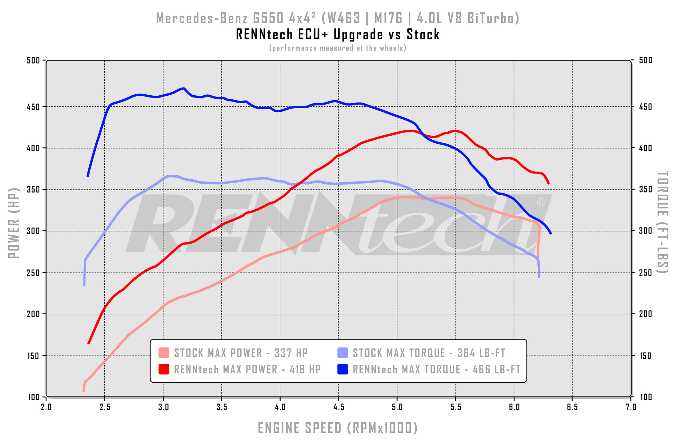 - Power gains are calculated based on stock numbers measured by RENNtech. Crank Performance Numbers are calculated with a 20% Drivetrain loss on G-Wagon models.
